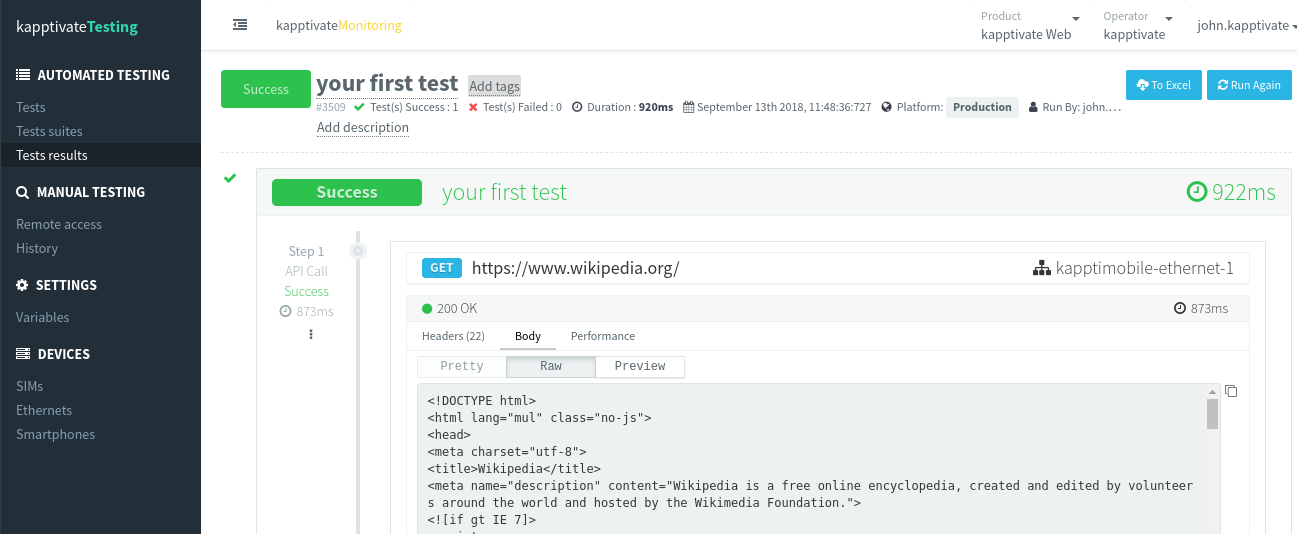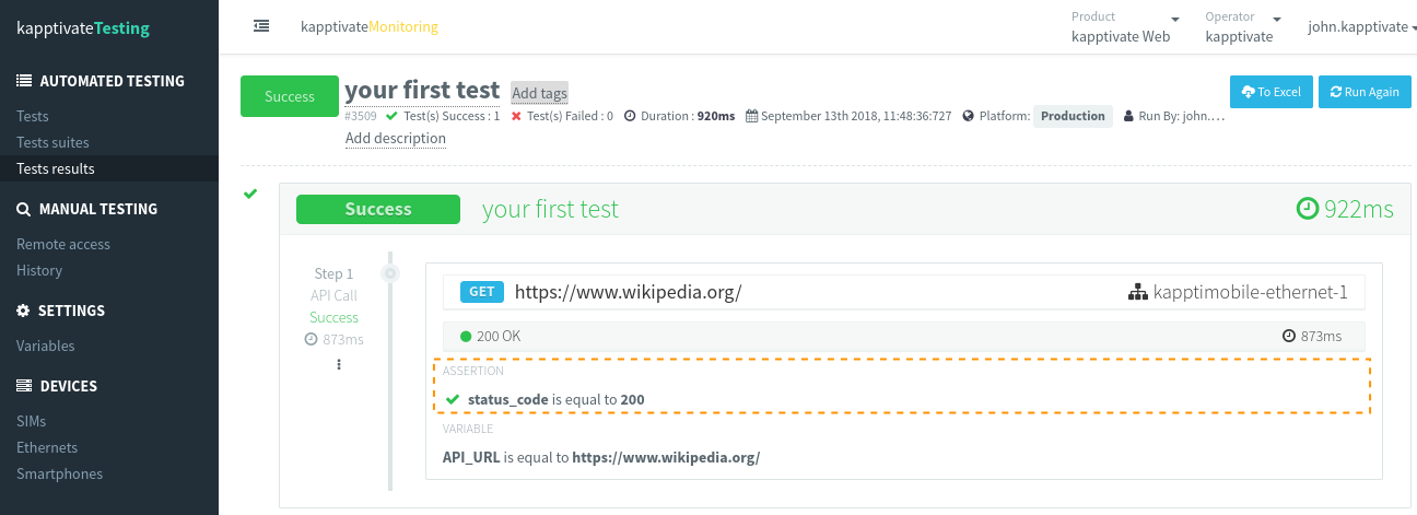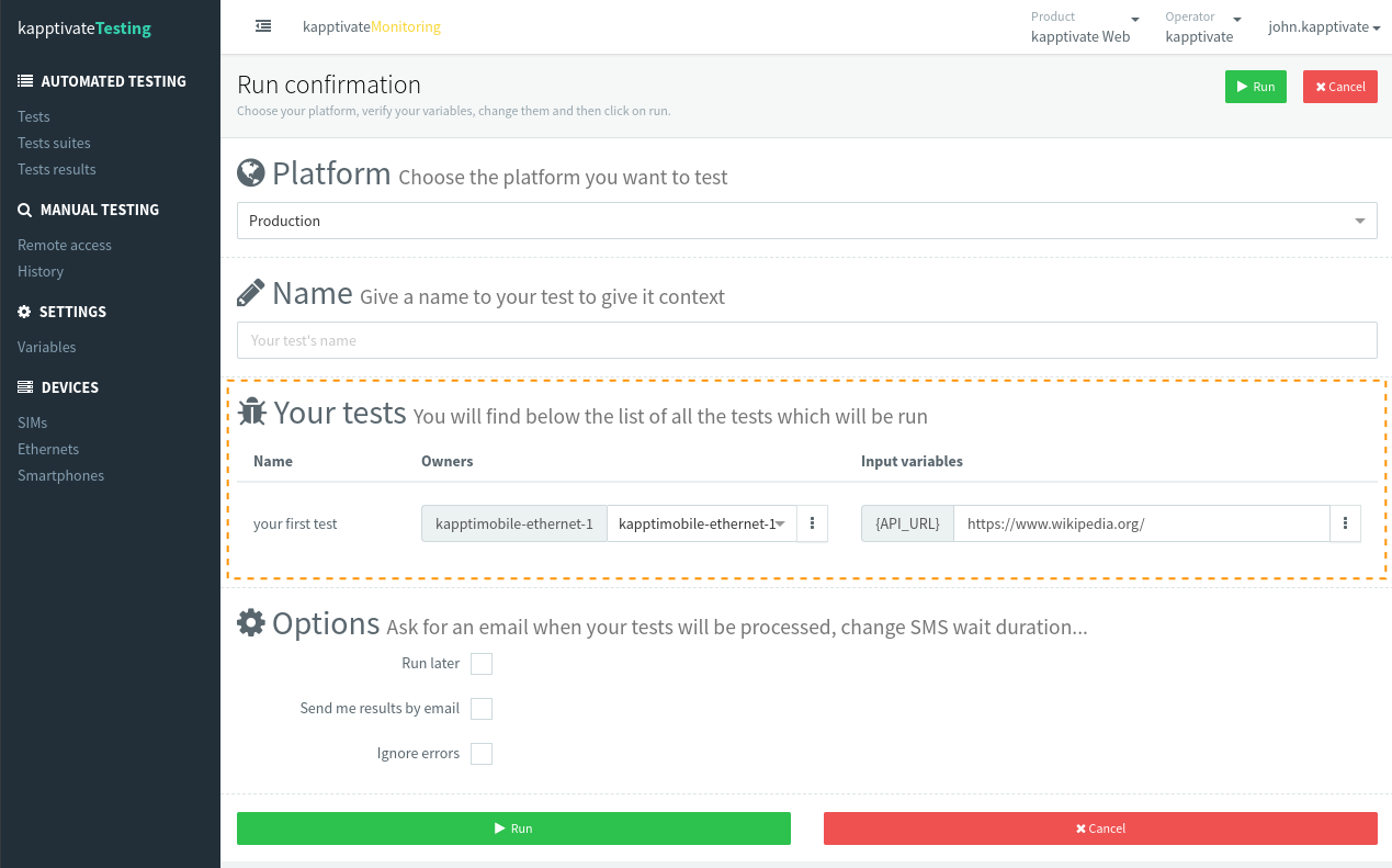 The purpose of this page is to let you customize the tests one last time before running them. In the area titled Your tests, you can override the variables. All the public variables will appear here, and all owners will appear in the Owners column. For instance, if you have a 3-step test and your steps 1 and 3 use the same owner kapptimobile-ethernet-1, you can change that owner (and decide, for instance, to use my-ethernet-2 instead). However, you cannot separately override the owner of each single step.