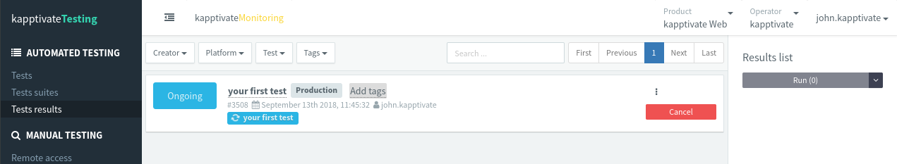 When the test starts running, its states becomes Ongoing. After it is finished, its state will be either Success or Failed.