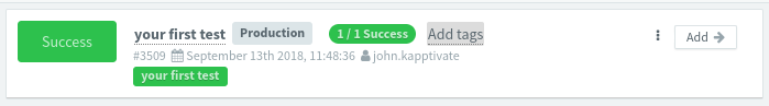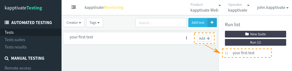 Now, let's save the test and run it! Saving the test redirects you to the tests page. Then, click the Add button next to its name, and the test will be added to the Run list in the right pane.