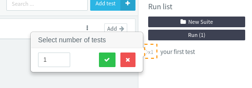 You can add as many tests as you want to the run list, different tests or the same test several time by reclicking the Add button. Alternatively, there is another way of repeating a test several times. Just click on the x1 (or x2, x3, etc... depending on the number of repetitions) next to the test in the run list: