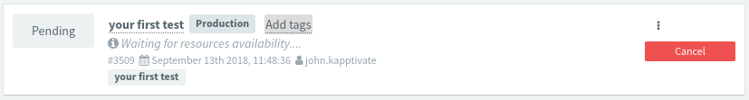 Since a resource (owner) may be used by any number of tests but never at the same time, a test will not start as long as at least one of its resources is busy (used by another test that is still running). If such is the case, then our test will remain in Pending state until the resource is freed: