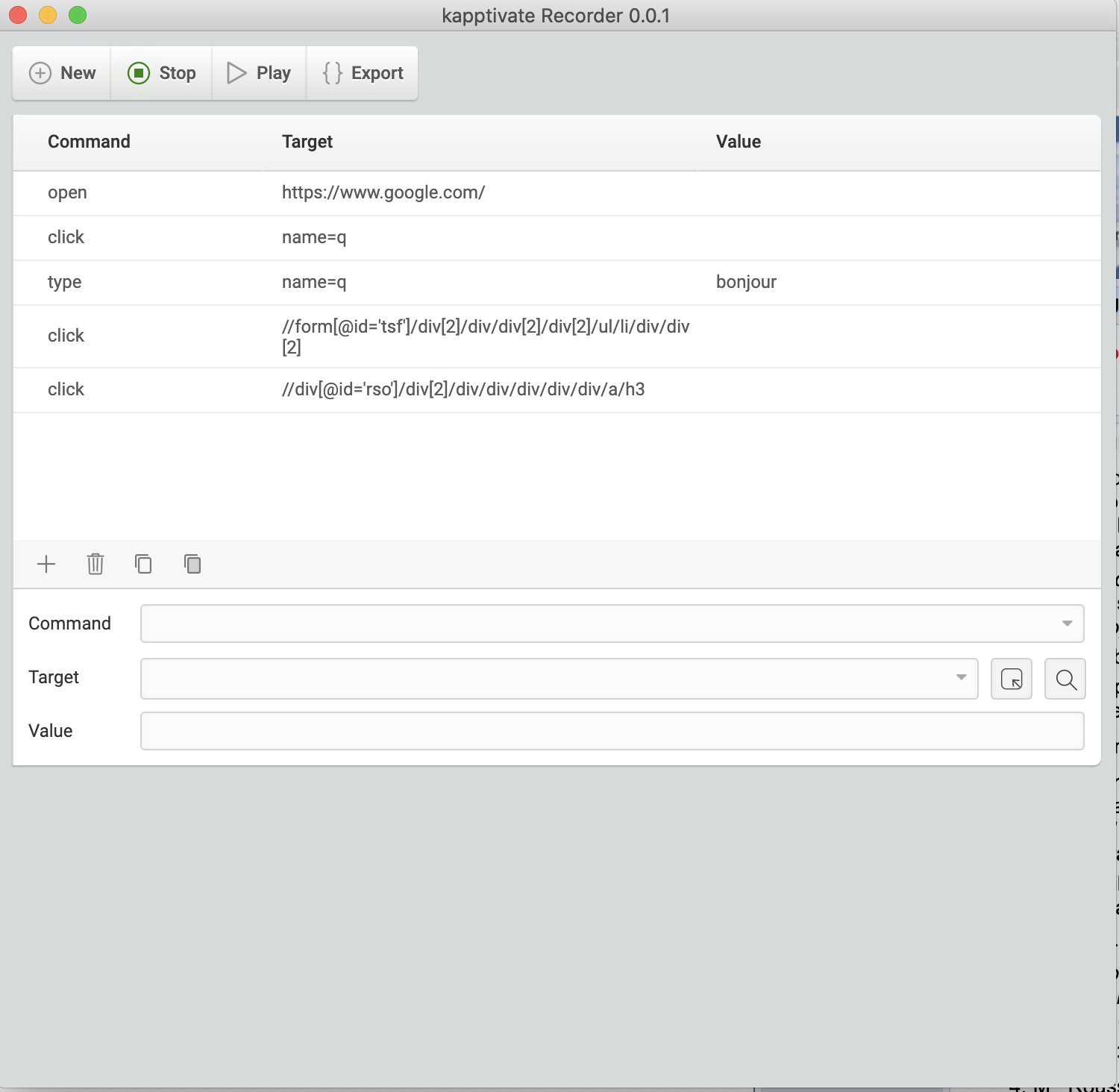 To record a new web test, click on “Record” then go to a web page and press enter. You can now navigate through the page, enter text etc. Once you have finish your scenario, click again on the kapptivate icon to get the Web Recorder view which is now filled with your actions: