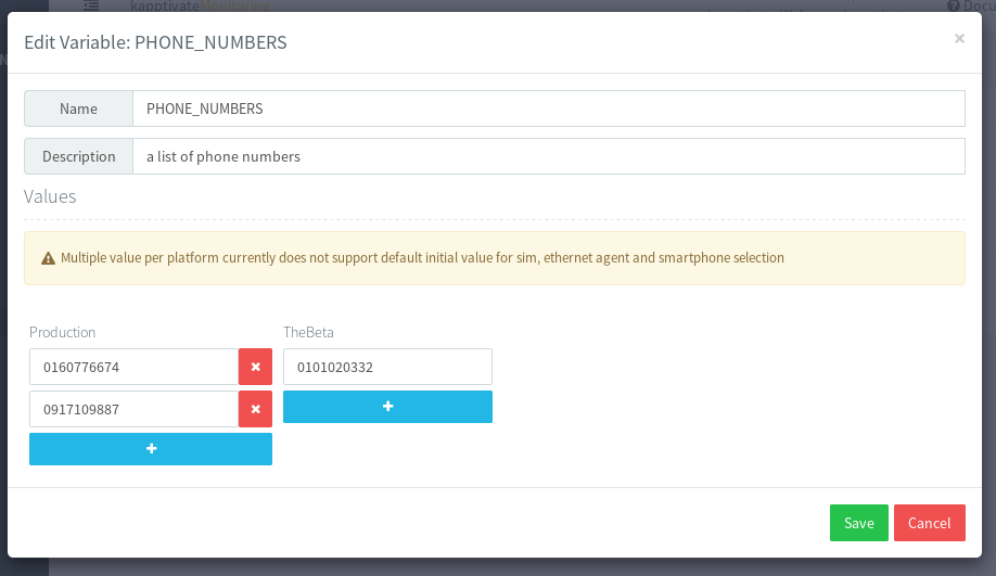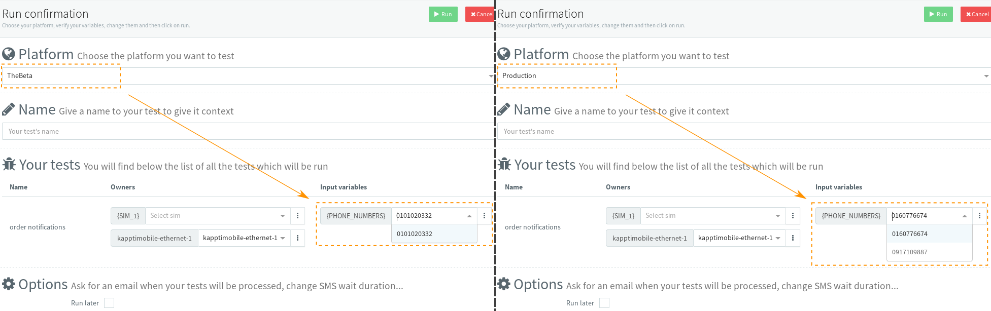 Let's say that you have two platforms Production and TheBeta, and imagine that you have a global variable PHONE_NUMBERS used in many tests to select which number to call. You can decide to call a different number depending on whether you're running your test on Production or TheBeta platform.