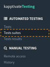 First, go to the Tests suites page, by clicking the corresponding entry in the left side menu: