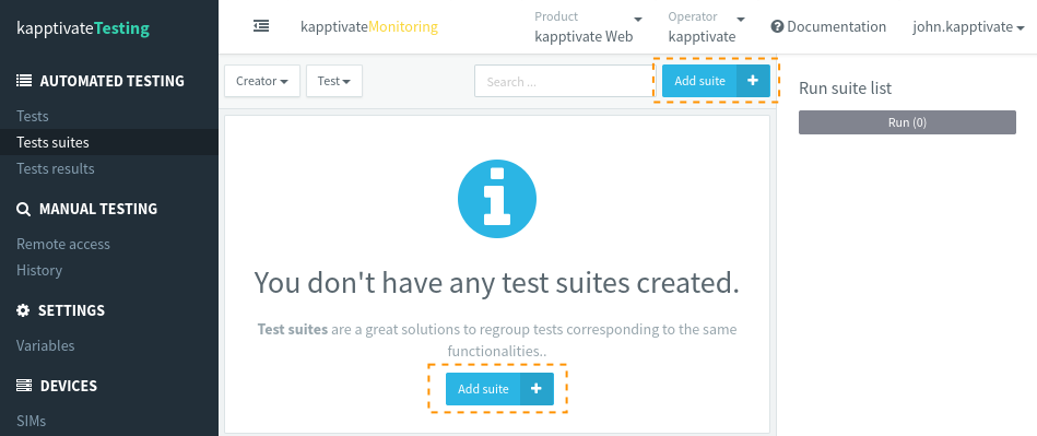 Any time you wish to launch one or more tests suites, go back to the Tests suites page and click Add: