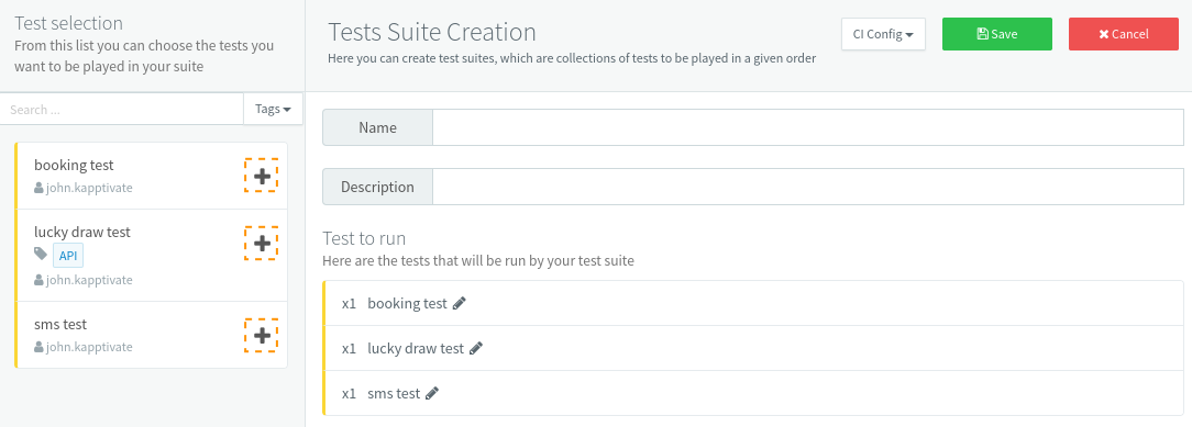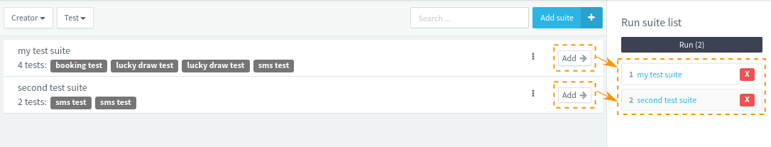 Just click one of the Add suite buttons to create a new tests suite. The existing tests are listed in the left part. You can add them by clicking them: