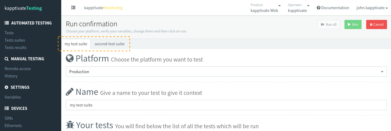 You'll be taken to the Run confirmation page, the same as the page you land on when selecting individual tests for running. The only difference appears if you have added more than one tests suite to the run list. Then, you will see one tab per tests suite: