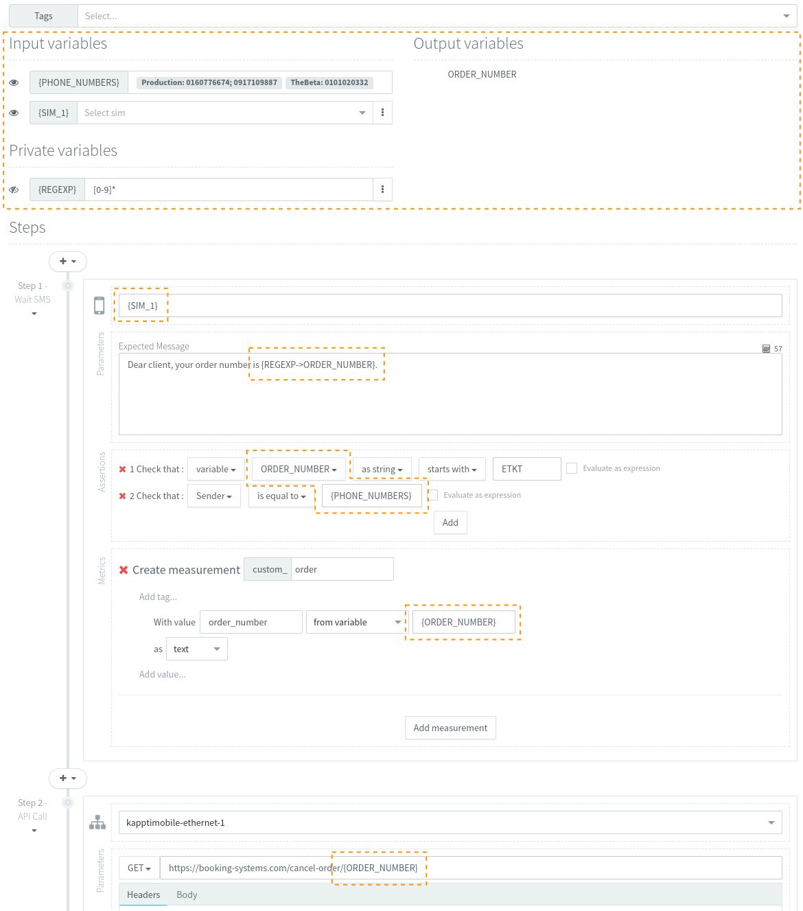 A variable is just a value that can change and that you wish to save or reuse in a test. For instance, if you use the same phone number for all your SMS tests, you may find it convenient to save that number in a variable so that you can change it globally at once. Besides, you can also, inside your test, save the result of an action (USSD, SMS, API, etc) inside a variable to reuse it in later actions (but it cannot be reused in other tests).