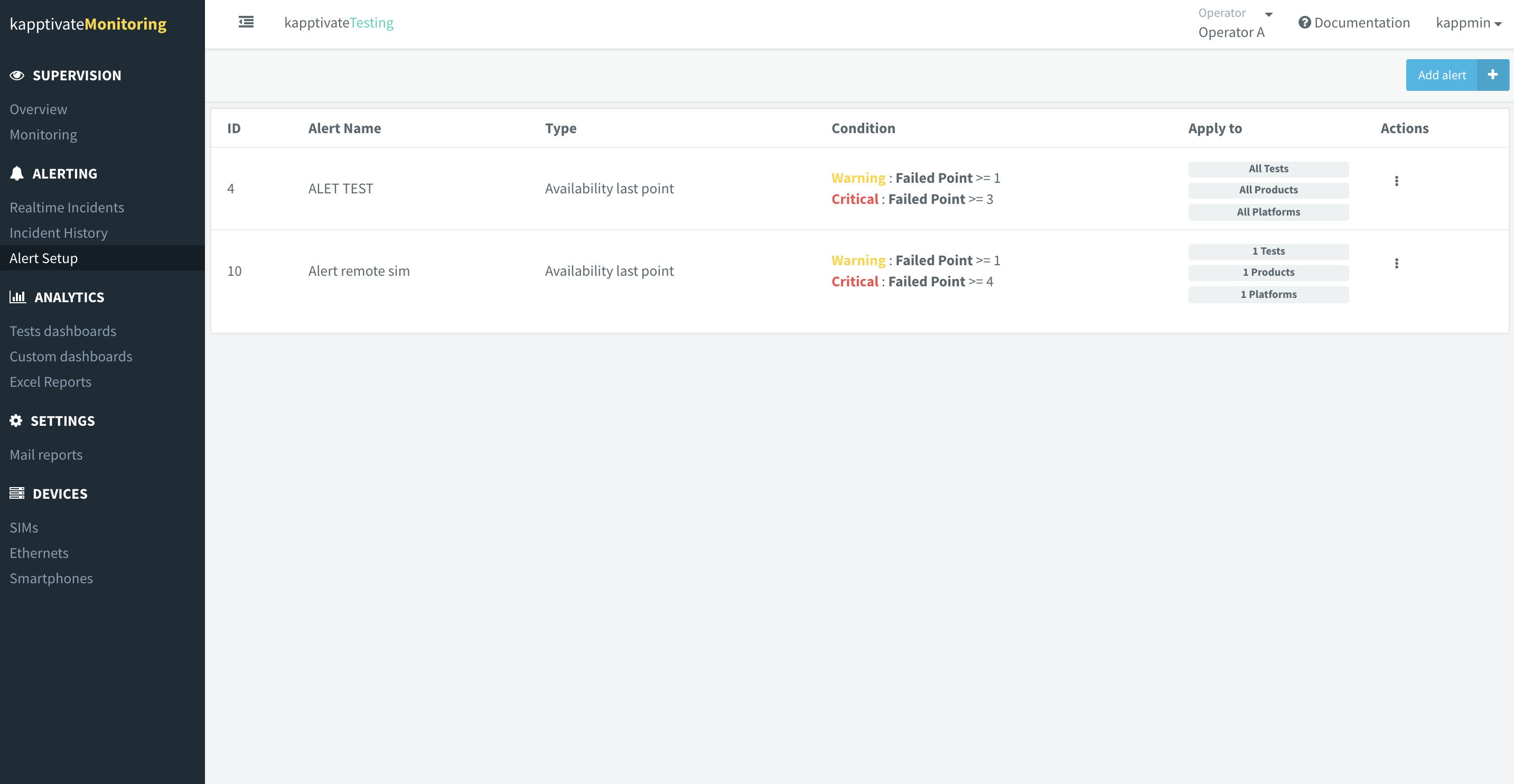 You can access the alert setup page by clicking on "Alert setup", under the alerting section. All the current alerts are displayed.